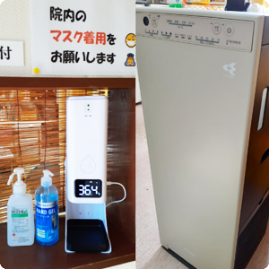 検温・消毒・換気・マスク着用・空気清浄機(DAIKINストリーマ)の設置等で、感染対策を行っています。
